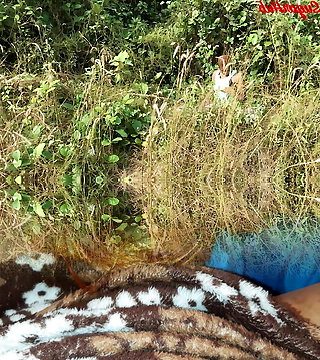 Ebony in lingerie gives a handjob to a lucky fellow
