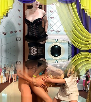 Sizzling housewife Lukerya joyfully flirts in the kitchen with a bowl of coffee while sitting on the washing machine to the