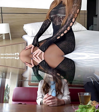 VIP4K. Dominant brown-haired in black pantyhose uses big fucktoy to impress her GF