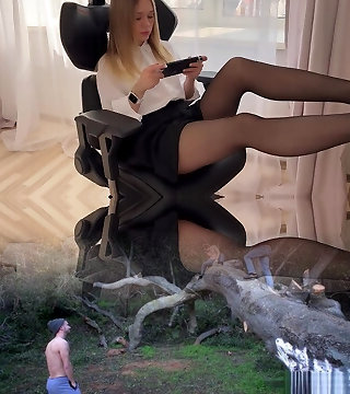 Trampy Blonde Teasing In See Thru Shirt, Shorts and Pantyhose