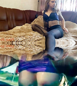 Gorgeous black-haired Katia Casadei takes her high heels off and plays with her feet in tight stockings