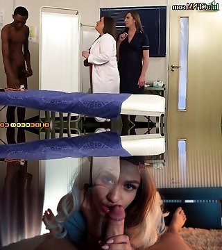 CFNM IR nurses in uniform and heels deep-throat black beefstick in 3way